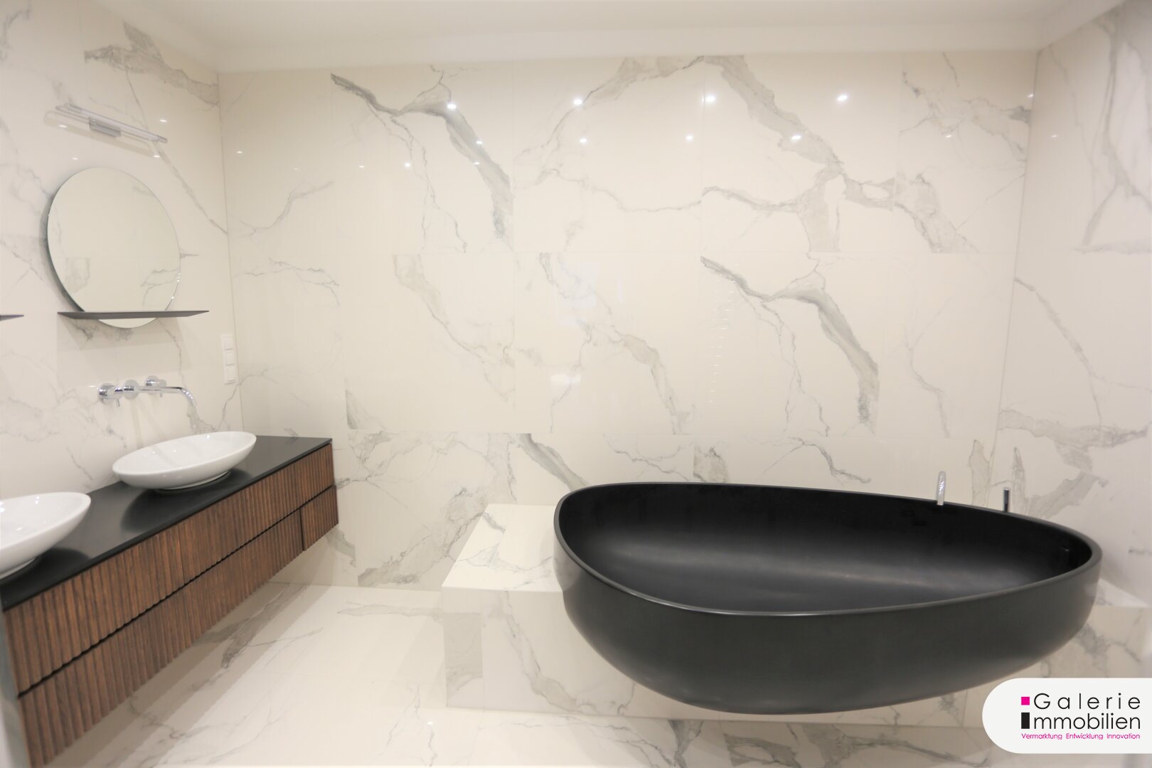 Die exklusiven Badezimmer mit Badewannenanlage, Dusch- und Waschbeckenanlage sowie ovalen Spiegeln mit Facettenschliff, Beleuchtung und Design-Handtuchtrockner wurden verfliest mit Großformatplatten.