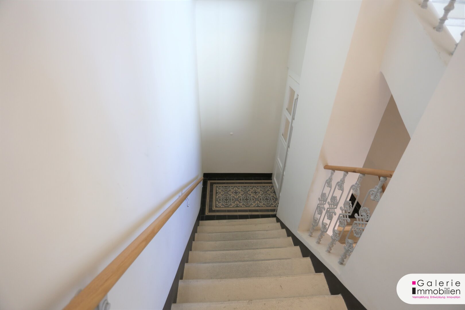 Das Stiegenhaus wurde weiß ausgemalt, der Boden mit traumhaft schönen Zementfliesen neu belegt. Die historischen Geländer und Handläufe wurden saniert und somit erhalten. Im Haus wurde eine Zentralschließanlage mit je 3 Schlüsseln zu jeder Wohnung installiert.