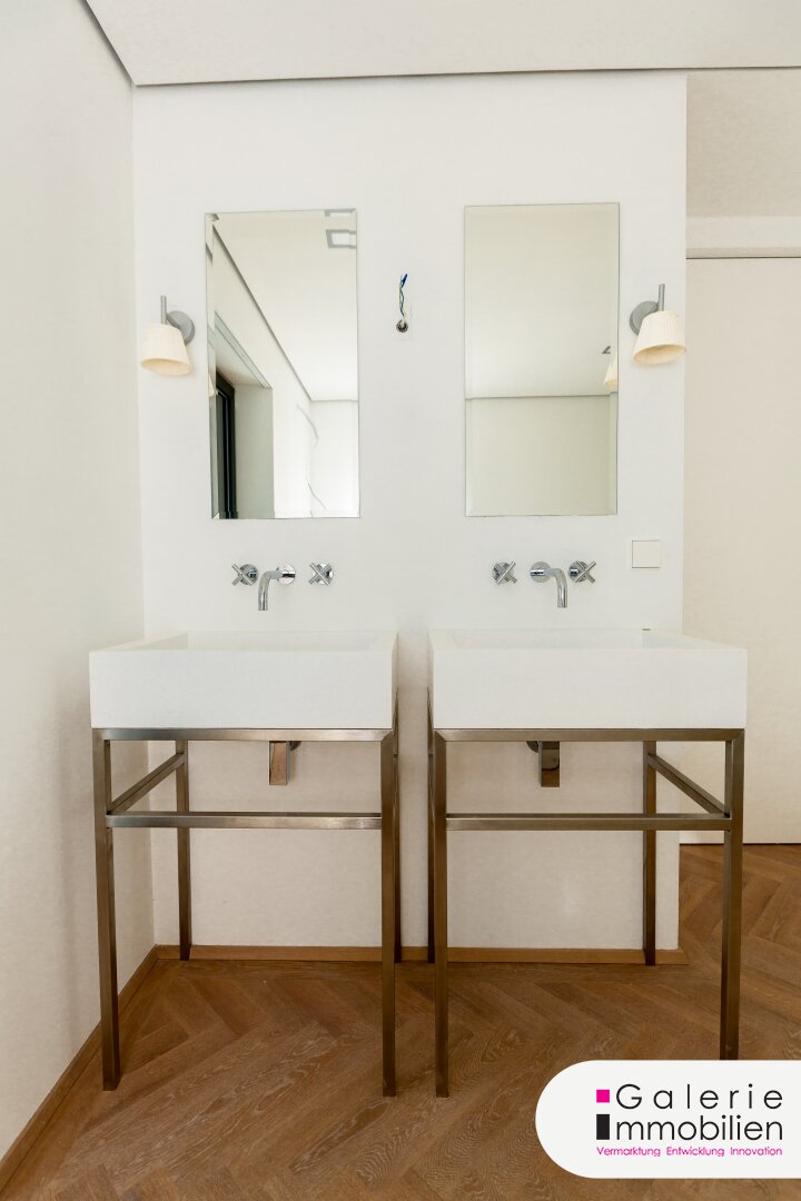 Auf dieser Ebene befinden sich weiters zwei Schlafzimmer, eines davon mit einem 8,75m² großen Balkon, ein Garderobenbereich, ein großes Badezimmer mit frei stehender Badewanne, einer Walk-in-Dusche, zwei Waschtischen und einem 2,91m² großen Balkon, eine separate Toilette, ein kleiner Abstellraum und ein Technikraum, alle vom großen Entree aus begehbar. Der Wohnung ist ein 3,10m² großes Kellerabteil zugeteilt.