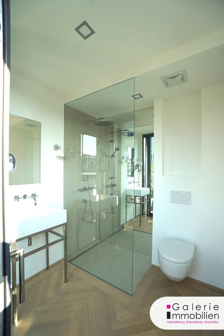 Geölter Fischgrät – Parkettboden (Eiche) in der ganzen Wohnung, Holz-Alu Fenster mit Drehkippbeschlägen, teilweise Hebeschiebefenster, elektrischer Sonnenschutz aus Raffstoren bei allen Fenstern, großformatige Fliesen sowohl am Boden als auch an den Wänden in allen Nassräumen,Terrassen mit Lattenrost-Belag, Bewässerungsanlagen und Außenbeleuchtung, Sicherheitstür, Gegensprechanlage mit Kamera, Fußbodenheizung, Decken- und Wandkühlung, Luftwärmepumpe, BUS-System, Dusche in den Kinder-/Gästezimmern, frei stehende Badewanne, Doppelwaschbecken und Bidet im Masterbedroom, Deckenspots LED und schaltbare Deckenauslässe, Spiegeln mit Wandlampen sind die besonderen Ausstattungsmerkmale. Die Raumhöhe von 2.70m wie auch die OW-Ausrichtung tragen zum wunderbaren Ambiente dieser außergewöhnlichen Wohnung bei.