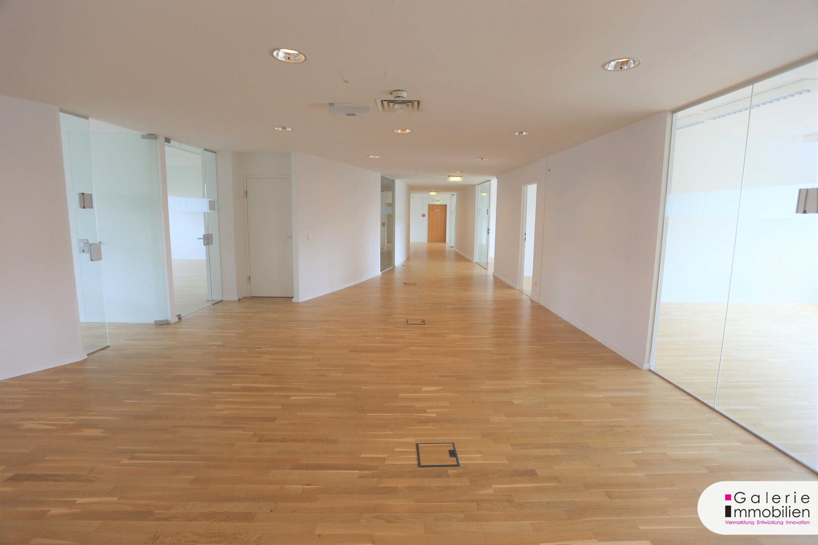 Von Vorteil ist, dass die Räumlichkeiten zum Großteil zentral vom Foyer begehbar sind. Die Büros sind mit sehr schönem Parkett belegt, die Nassräume sowie Teeküche sind verfliest.