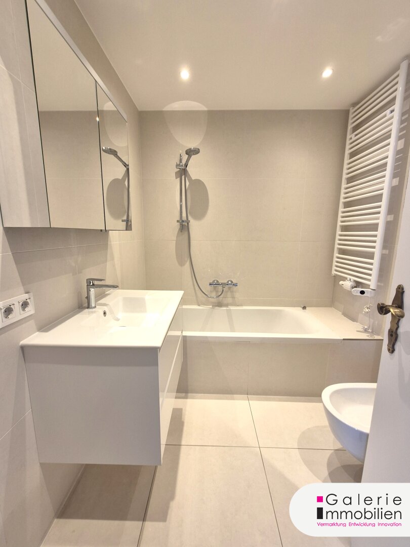 Das große Bad mit Badewanne, Waschbecken und Spiegelschrank, Toilette und Bidet sowie Handtuch-Heizkörper wurde vor kurzem komplett erneuert, ebenso das kleine Bad mit Dusche, Waschbecken und Spiegelschrank. Eine separate Toilette befindet sich im Eingangsbereich.