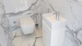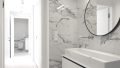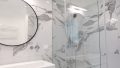 Genießen Sie prickelndes Duschvergnügen in der modernen Badewelt mit Tropenbrausen-Dusche, höhenverstellbarer Handbrause und eleganter Ablaufkante, Handtuchtrockner, einem Waschtisch mit Spiegel und Unterschrank sowie integrierter Bad-Entlüftung.