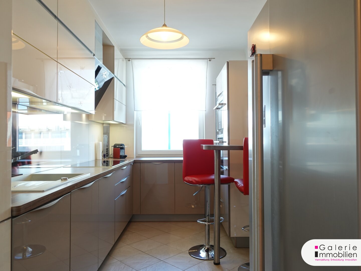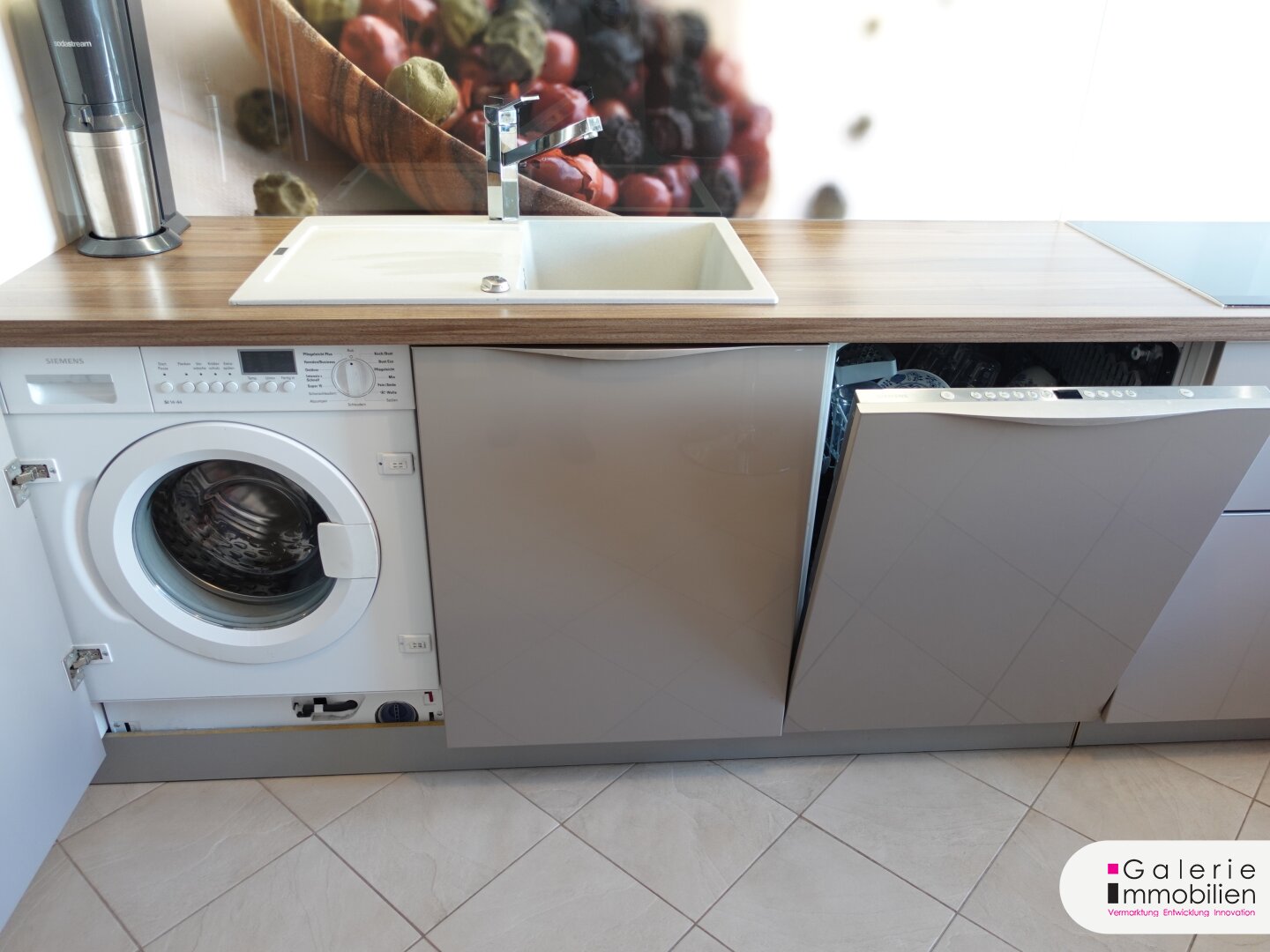 Verwöhnen Sie sich und Ihre Gäste mit kulinarischen Köstlichkeiten aus der modern eingerichteten Küche mit Siemens-Markengeräten inklusive kleinem Frühstücks- und Bar-Bereich! Das schöne Küchenensemble verfügt über einen Induktionsherd, Dunst-Abzug, Spüle, Geschirrspüler, Backrohr, Dampfgarer, Wärmelade, einen freistehenden Doppeltüren-Gefrier-Kombischrank, zahlreichen Ober- und Unterschränken mit viel Stauraum inklusive Drehregalen und eine integrierte Waschmaschine. Sehr praktisch ist auch die Glas-Schiebetür am Kücheneingang und das Küchenfenster in den freien Loggia-Bereich.